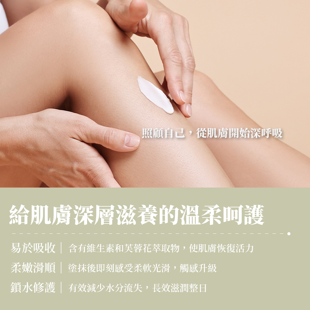 [成分] 純淨溫和身體乳:積雪草萃取物、玻尿酸、維他命B5、植物性乳木果油
