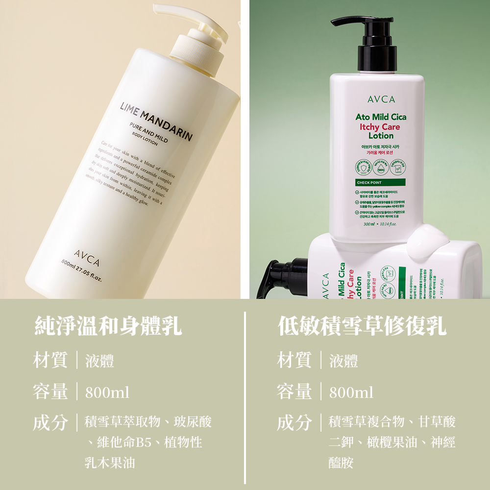 [容量] 800ML(純淨溫和身體乳)、300ML(低敏積雪草修復乳)
