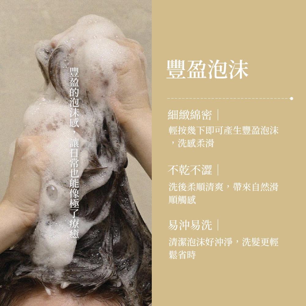 柔細泡沫在髮絲間綻放,洗去疲憊、也留住柔軟。