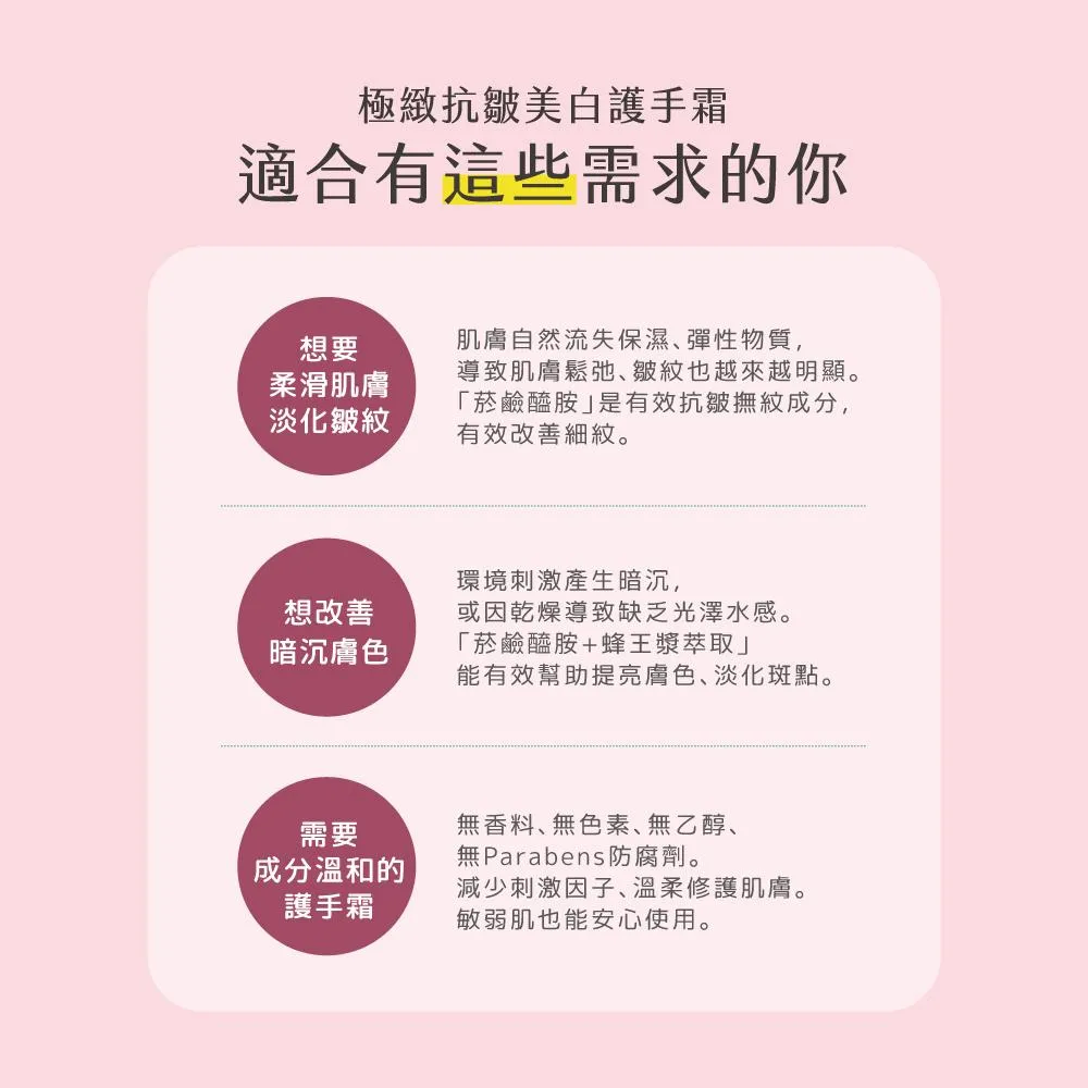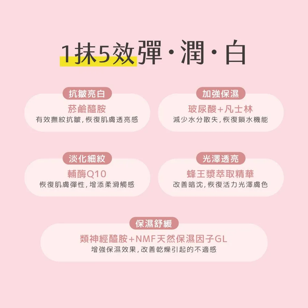 ◾添加 蜂王漿萃取、苯酸醯胺 等亮膚配方